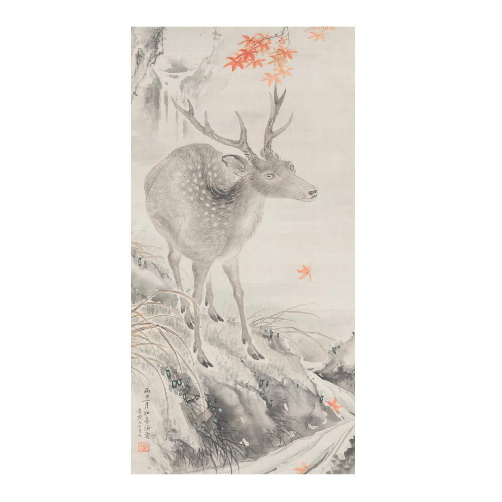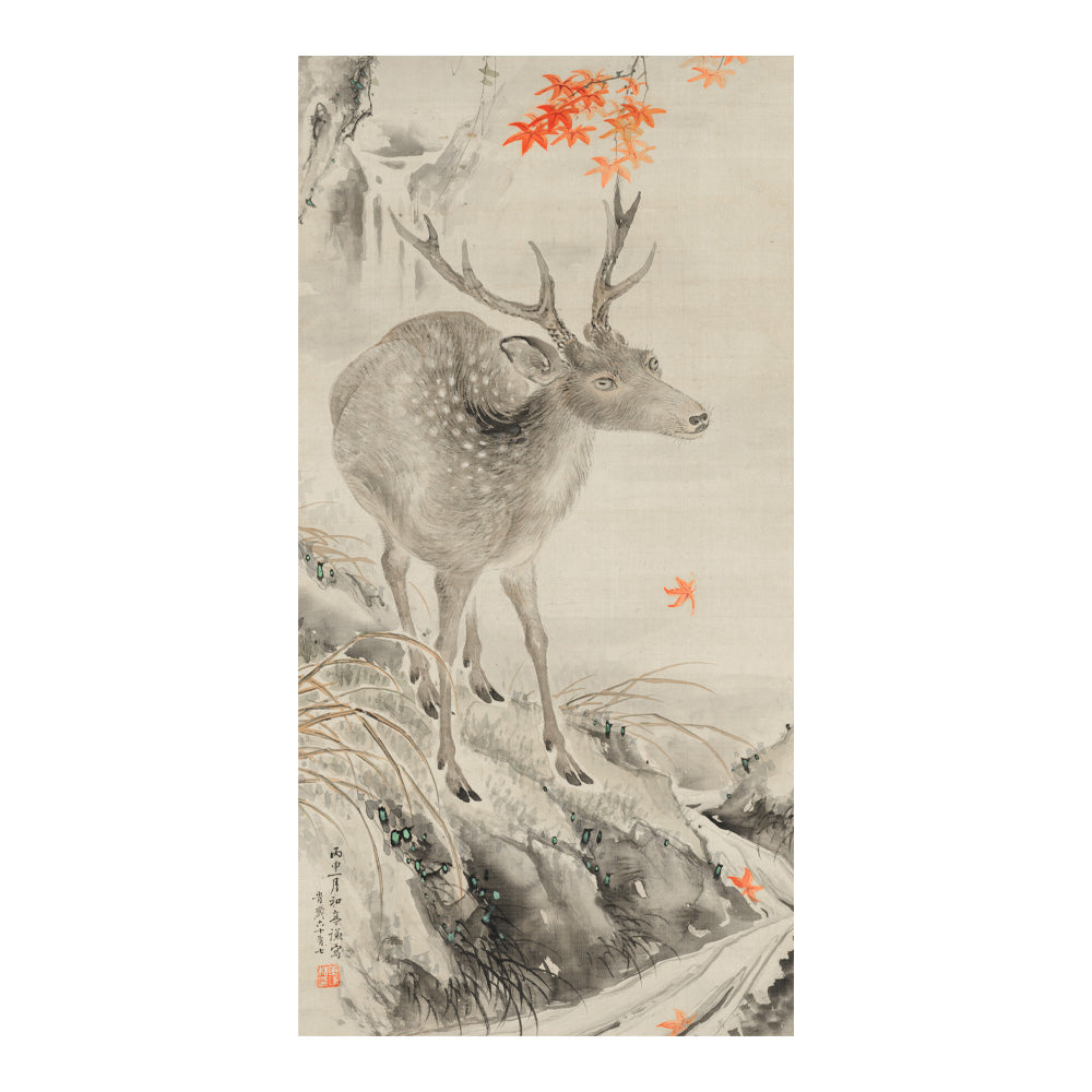「渓流沿いの鹿(けいりゅうぞいのしか)」は、滝和亭の代表的な作品の一つで、山間の渓流の近くで草を食む鹿を描いています。