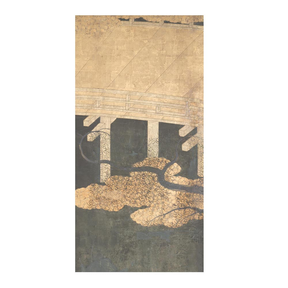 「柳橋水車図屏風(やなぎばし すいしゃず びょうぶ)」は、柳橋という場所に架かる橋と、その周りにある水車を描いた作品で自然の静けさと調和を感じさせる美しい構図が際立っています。