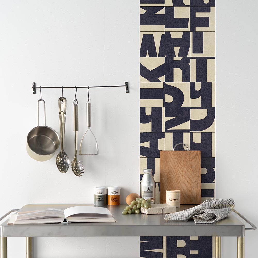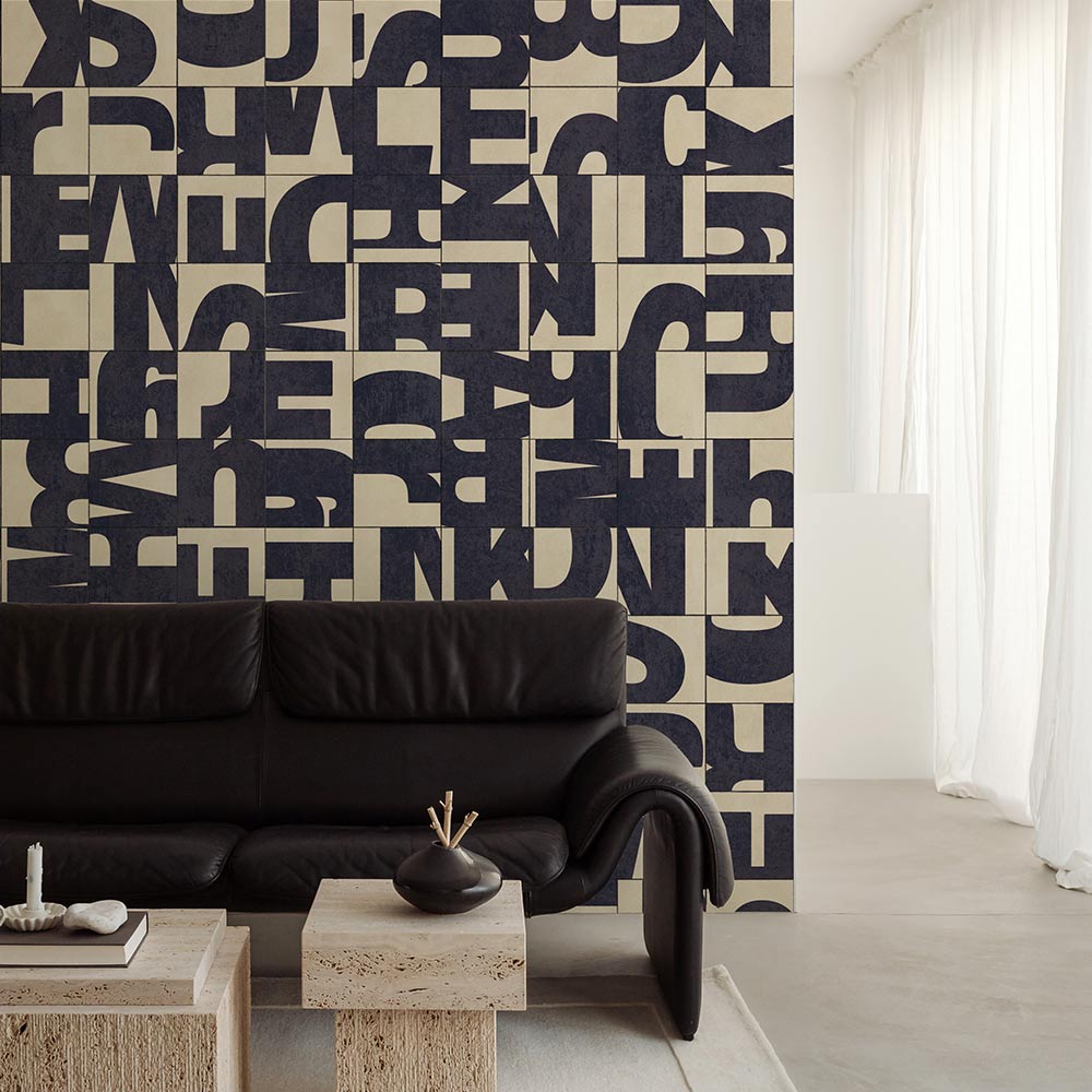 アルファベットをブロック状に分解し、タイルとして再構成したデザイン。