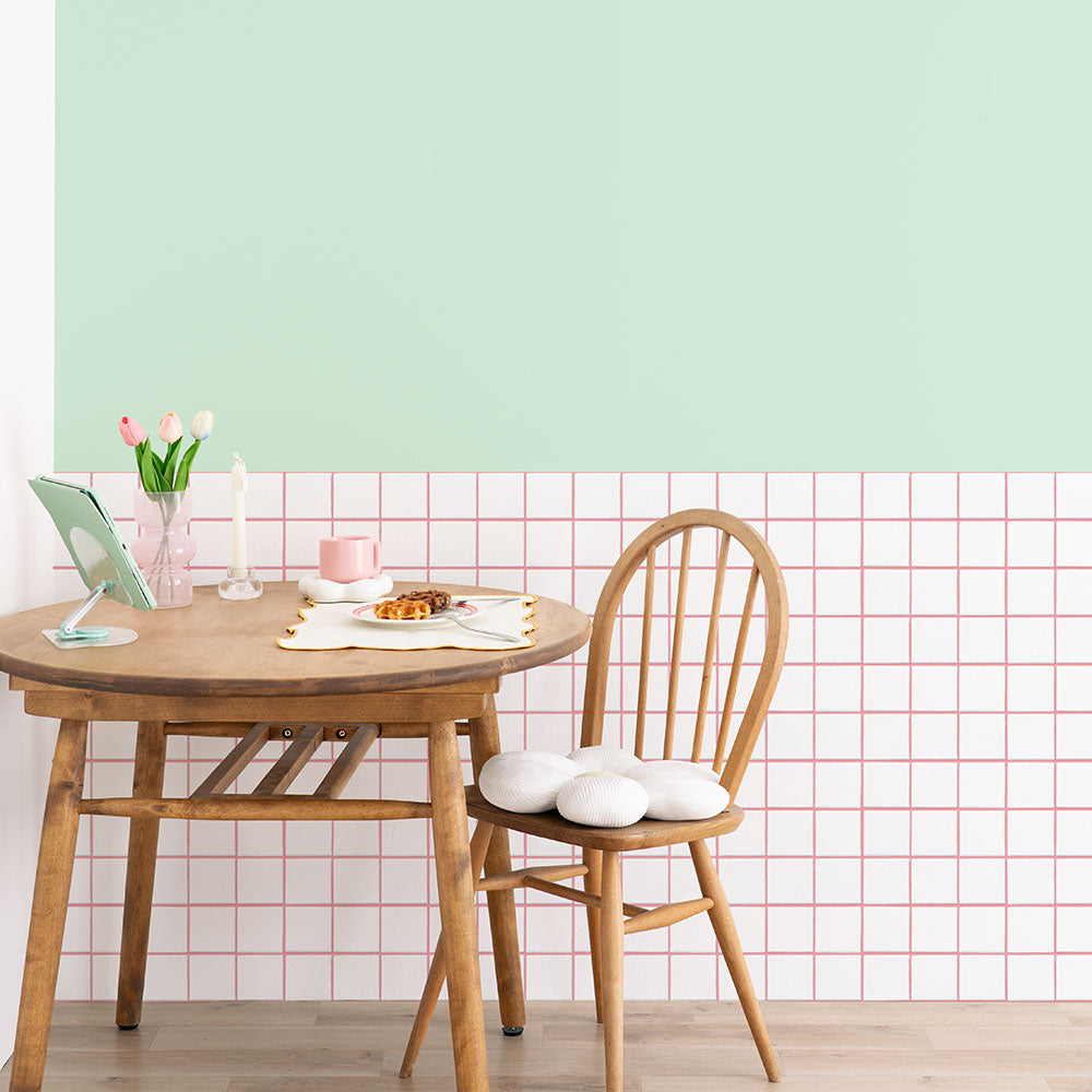 すっきりシンプルな無地に、パッと明るい目地色のタイル柄を合わせたポップなデザイン