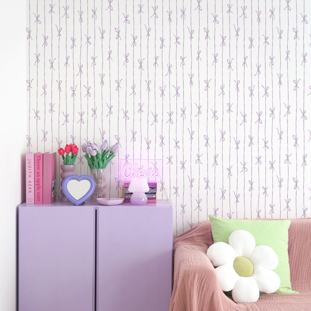 はがせる壁紙 のりなしタイプ What's poppin? リボンストライプ ナチュラル (49cm×2.5mサイズ) ラベンダー