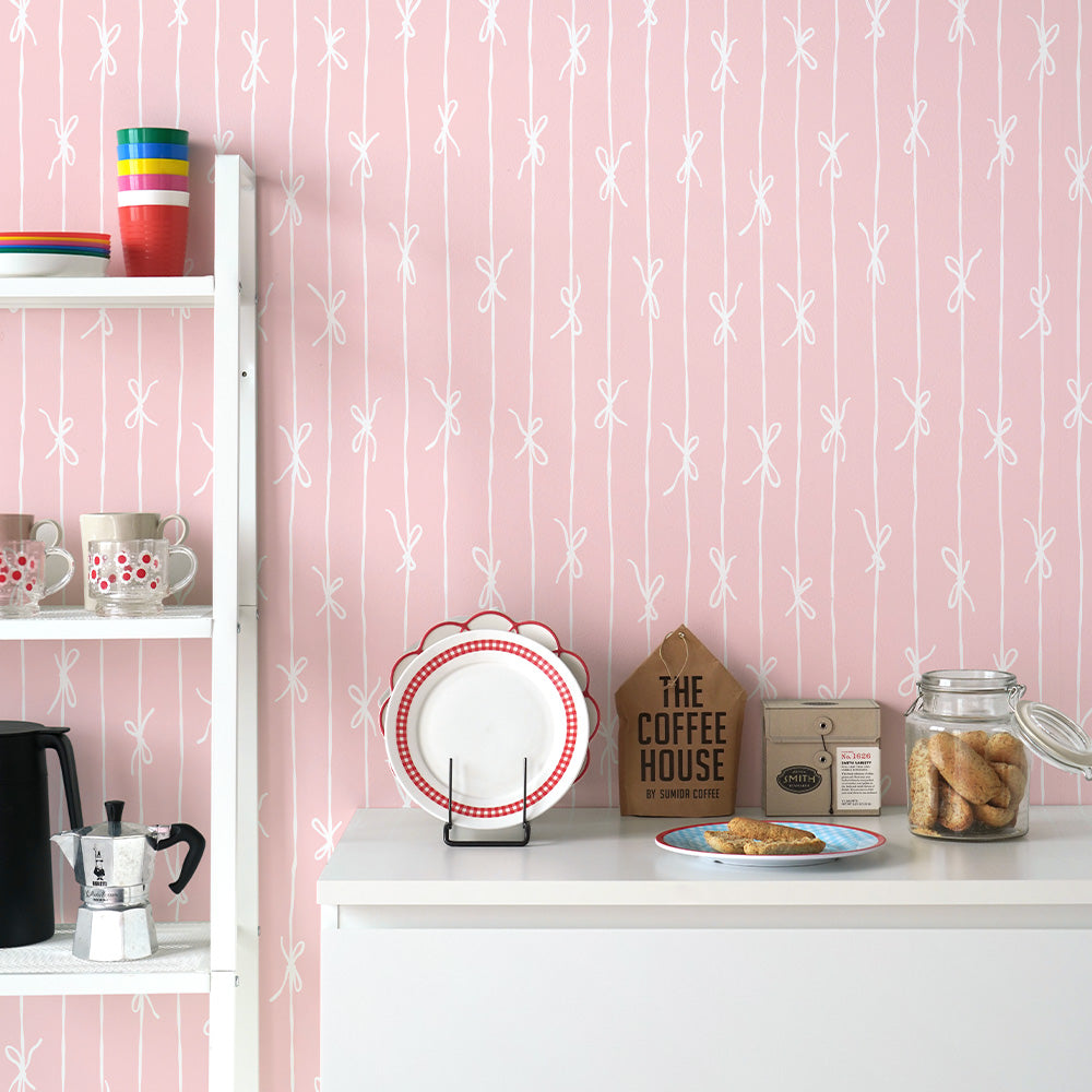はがせる壁紙 のりなしタイプ What's poppin? リボンストライプ ナチュラル (49cm×2.5mサイズ) チェリー
