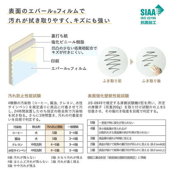 | 注意事項 | 【防汚】施工費割増しにご注意「スーパーハード防汚壁紙」は材質が硬く凹凸の比較的少ない壁紙のため、下地処理はより平滑に行い、圧着は樹脂ヘラを使うなどしてより丁寧にエア抜きをしてください。 |
