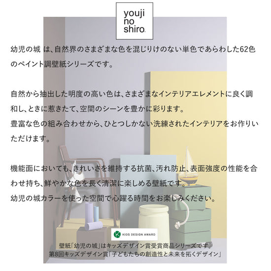 「幼児の城」は、自然界の色を活かした62色展開のペイント調壁紙シリーズ。混じりけのない明度の高い単色は、さまざまなインテリアと調和しながら、空間を彩るアクセントにもなります。