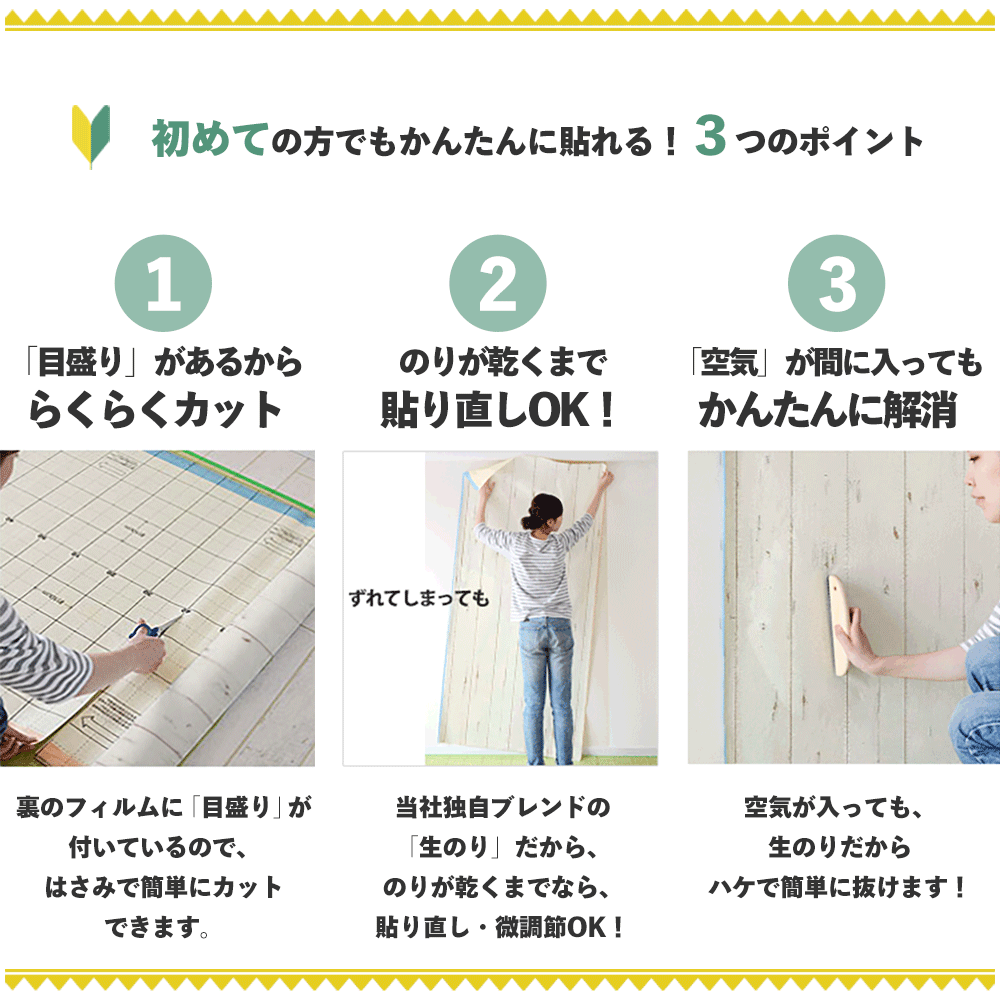- のりが乾燥してしまうので、生のりつき壁紙の保管期間は2〜3週間程度となります。