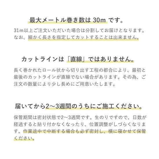 - のりが乾燥してしまうので、生のりつき壁紙の保管期間は2〜3週間程度となります。