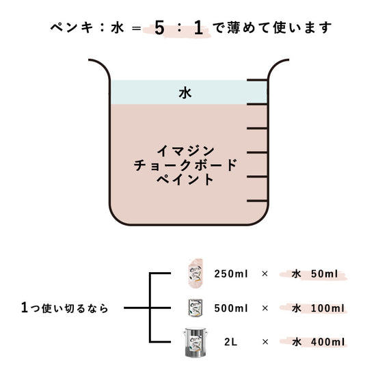・塗料100に対して水を20程度(塗料5 対 水1)で希釈し、よく混ぜてから塗ってください。