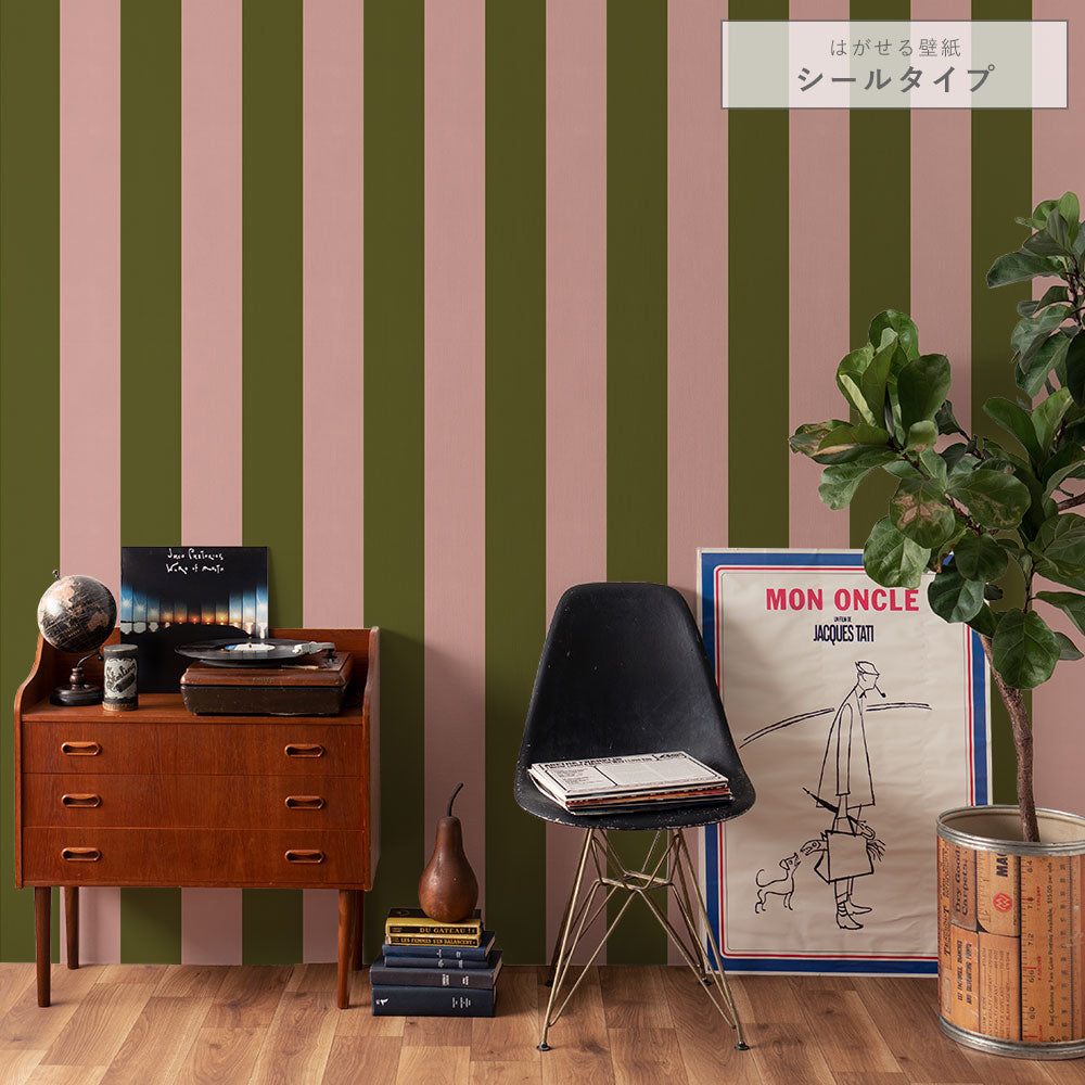 はがせる壁紙 シールタイプ ロンドンストライプW2 (49cm×3mサイズ) TKH-LS208 モスグリーン×ピンク