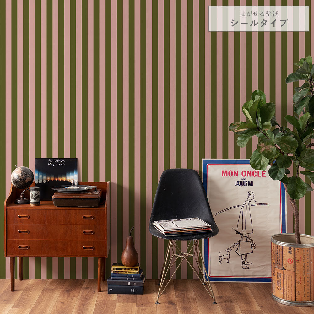はがせる壁紙 シールタイプ ロンドンストライプW6 (49cm×3mサイズ) TKH-LS608 モスグリーン×ピンク