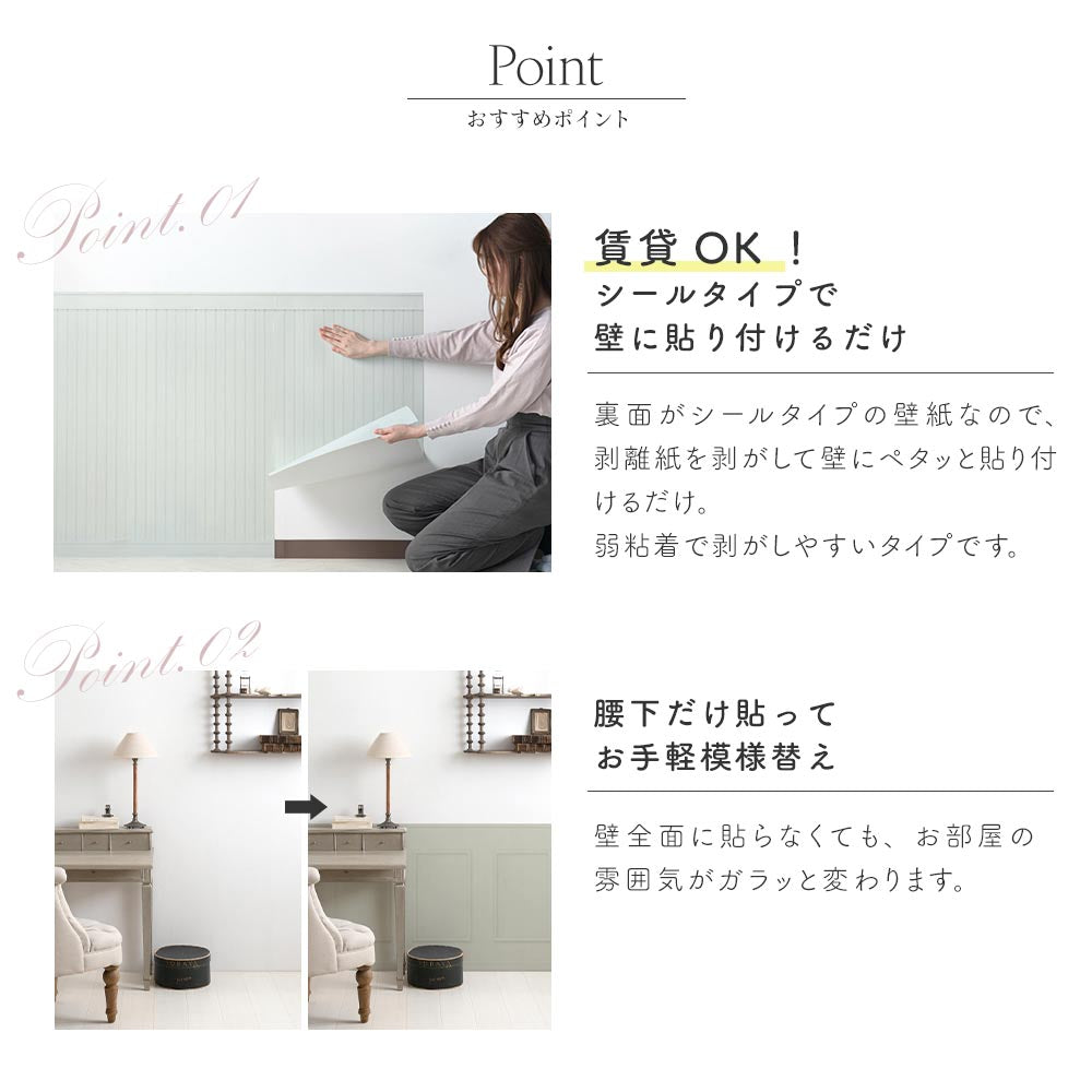 今ある壁紙の上から貼り付けるだけで、手軽に腰壁を楽しむことができます。