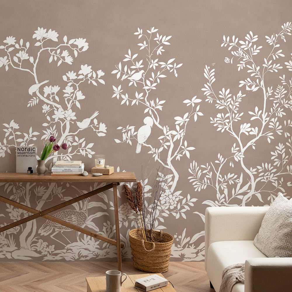 シノワズリな植物と鳥のデザインをインテリアに合わせやすいくすみカラー1色で表現