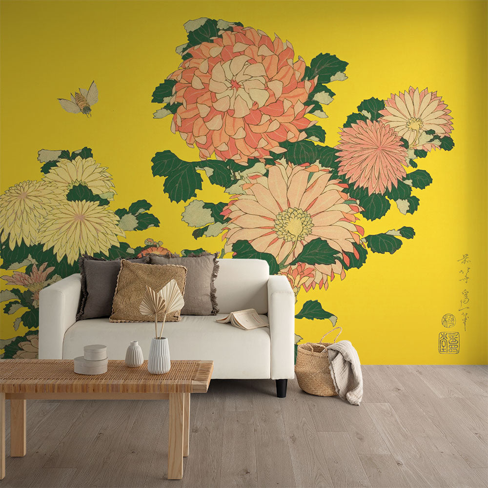 はがせるミューラル壁紙 シールタイプ 葛飾北斎 菊に虻(イエロー背景) TSO-M00002