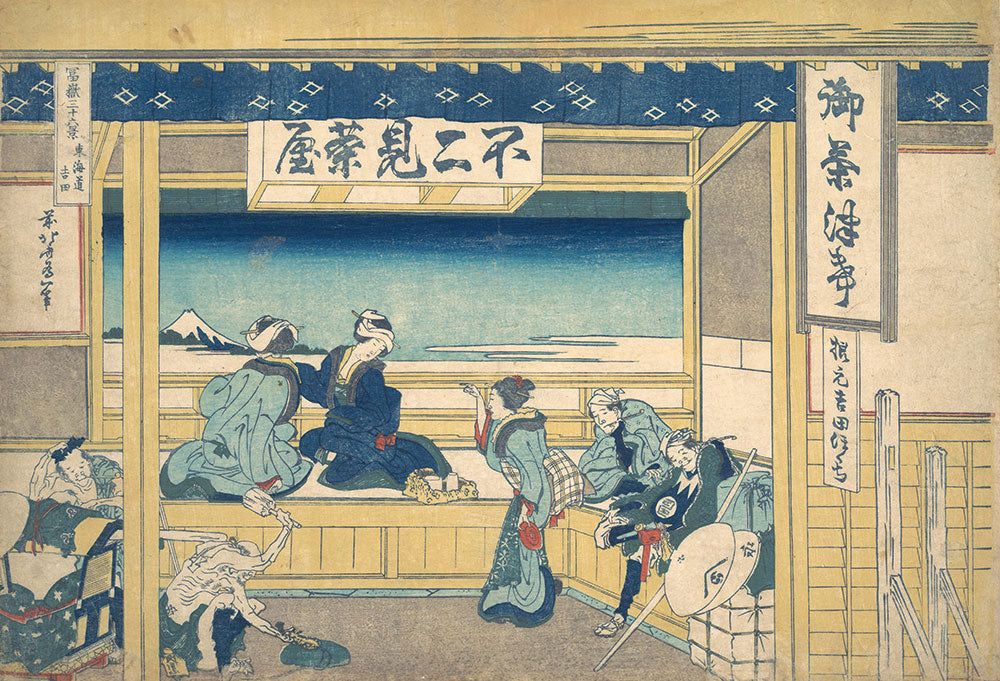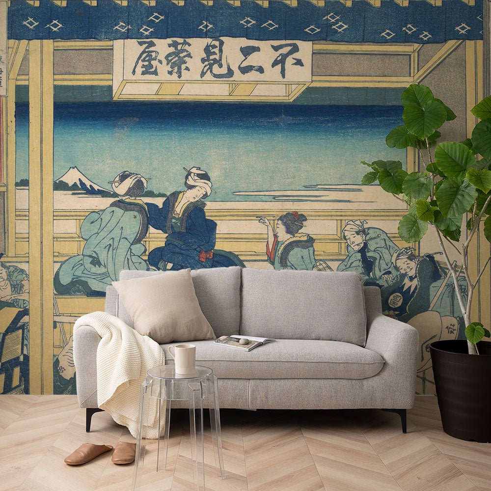 「不二見茶屋」の看板の名の通り、富士の眺望を売りにした茶屋での様子。開放的な座敷で、女性客たちが見物を楽しんでいるのが確認できる。
