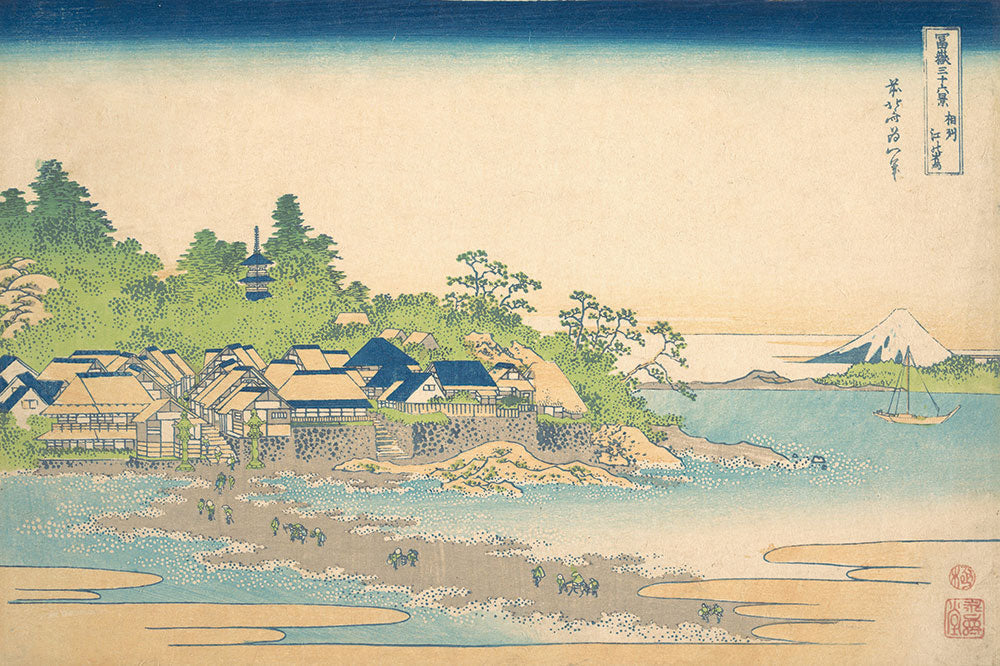 江の島は当時も人気の観光名所。当時は橋がなかったため、干潮時にだけ現れる砂洲を急いで渡っている。