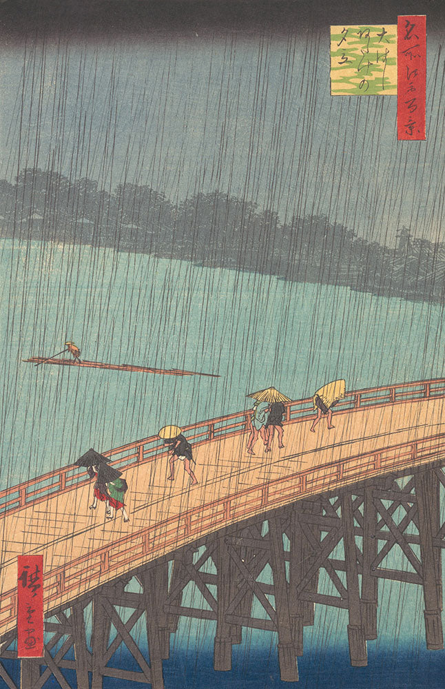 歌川広重は江戸時代の浮世絵師。急に振り出した雨に、足早に橋を行きかう人々が確認できる。後にゴッホが模写したことでも有名な作品。