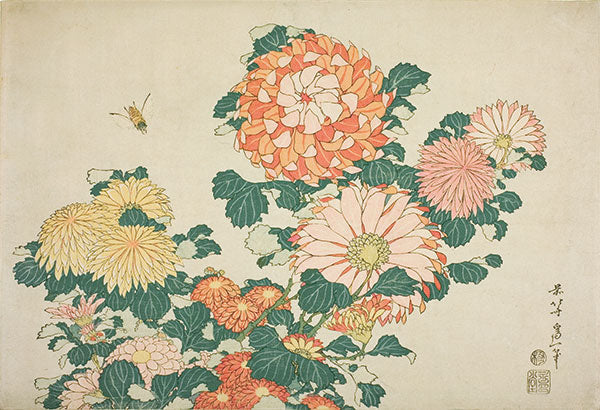 季節の花を描いたシリーズの1枚。秋に咲く菊を描いた錦絵。