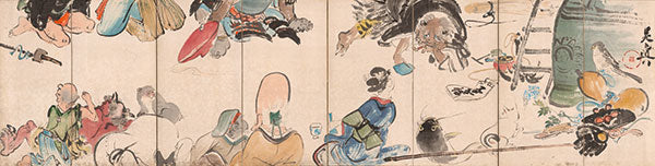 大津絵の定番の人物像が大集合した絵。江戸時代から明治時代の移行期に活躍した柴田是真は、日本の近代化によって失われつつある都市文化や庶民の娯楽を好んで描きました。