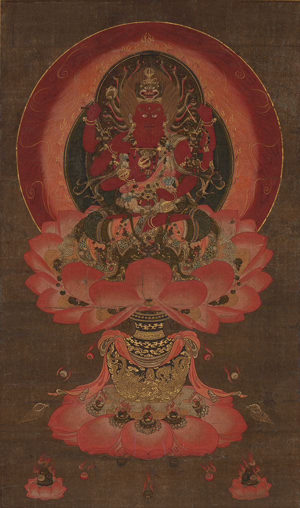 鎌倉時代から南北朝時代の作品。蓮の台座に座る愛染明王を描いている。