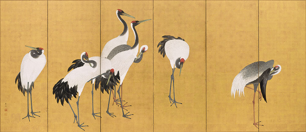円山応挙(まるやま おうきょ)は、江戸時代中期から後期の絵師で、「日本写生画の祖」とも呼ばれています。鶴は吉祥の象徴であり、長寿や繁栄を願う縁起の良いモチーフとして、屏風絵や襖絵にしばしば用いられました。