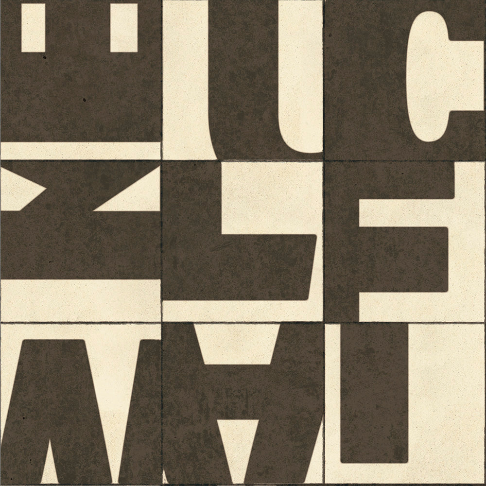 アルファベットをブロック状に分解し、タイルとして再構成したデザイン。