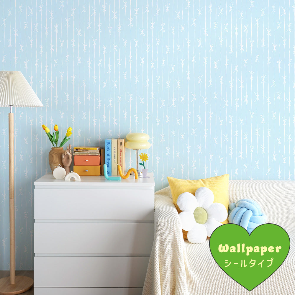 はがせる壁紙 シールタイプ What's poppin? リボンストライプ ナチュラル (49cm×3mサイズ) スカイ