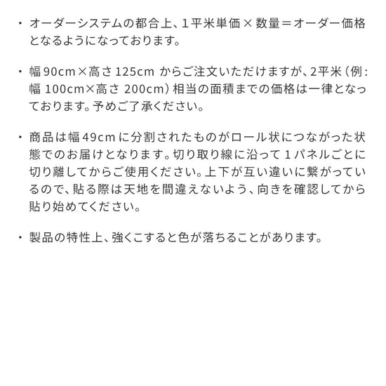 ご注文サイズの幅を49cmに分割してのお届けとなります。端の印刷部分が49cm未満になる部分には余白がつき、印刷部分が5cm以下だと施工が難しくなるので、少し大きめにオーダーすることをおすすめします。