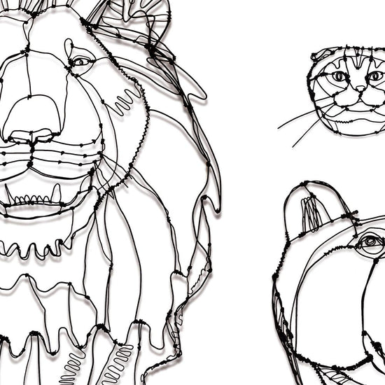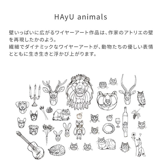 繊細でダイナミックなワイヤーアートが、動物たちの優しい表情とともに生き生きと浮かび上がります。