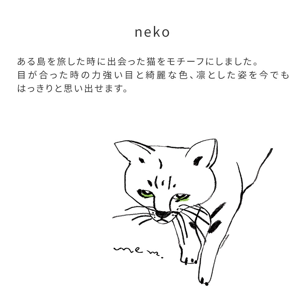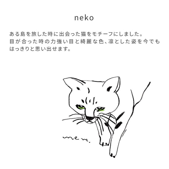 ある島を旅した時に出会った猫をモチーフにしました。目が合った時の力強い目と綺麗な色、凛とした姿を今でもはっきりと思い出せます。