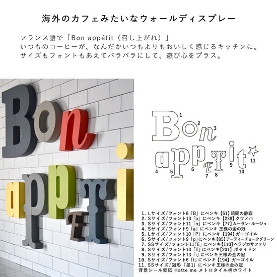 おしゃれなフォント8種類×4サイズから選べて、1文字からオーダー可能。イベントの飾りつけや店舗の看板にもおすすめ。