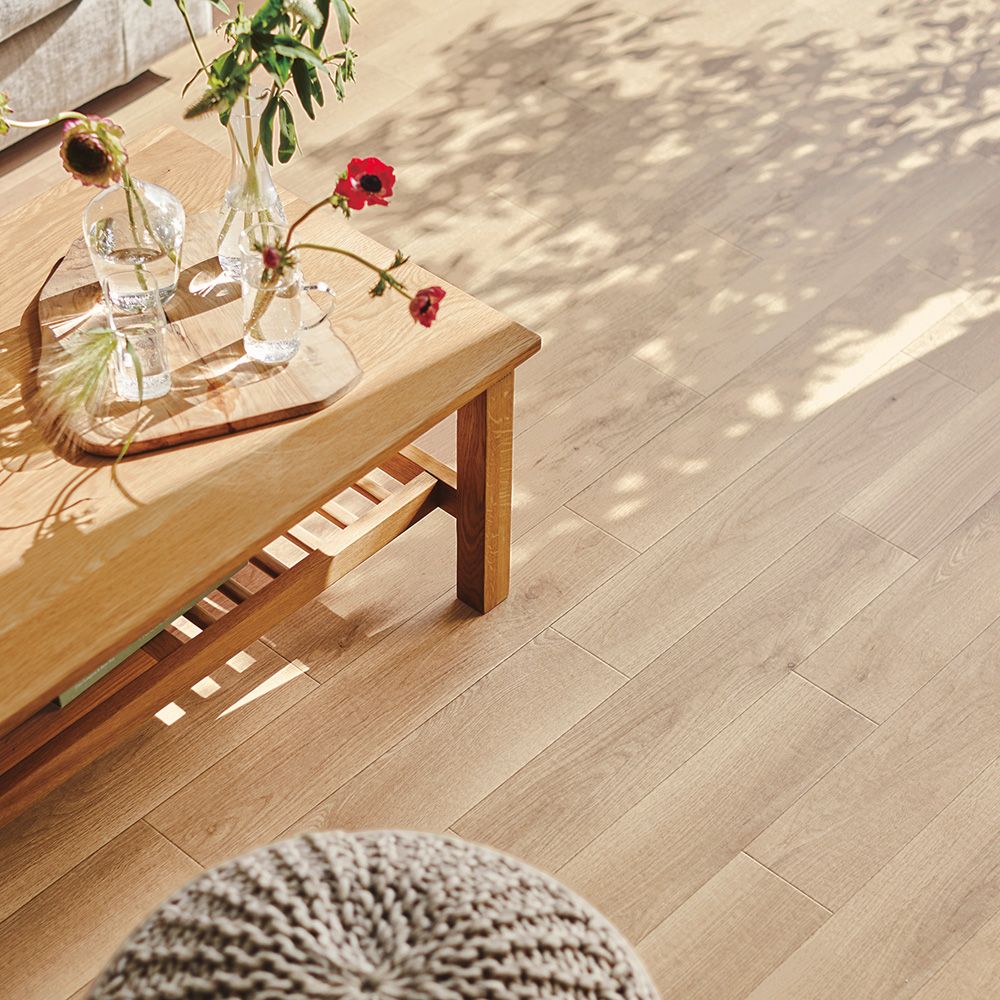 しっとりさらっとした質感のオーク。優雅で繊細な木目が特長です。グレージュのファブリックを活かす空間に。