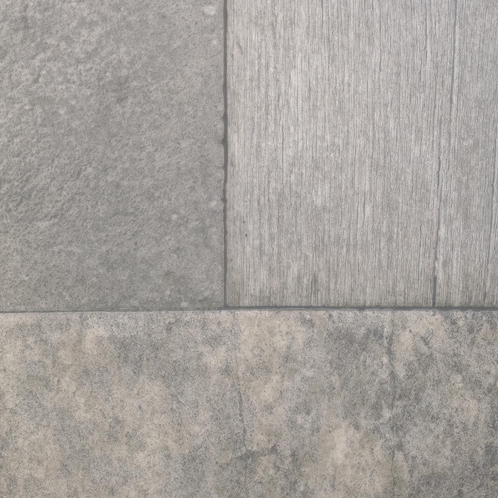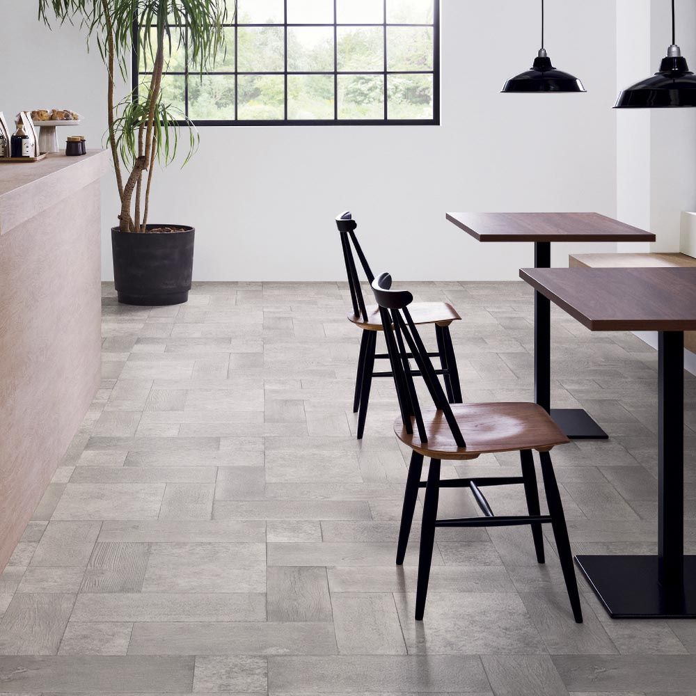 ストーン調のブロック柄とモルタルに転写した木目柄をランダムに配置したデザインです。カフェなどの空間にもおすすめです。