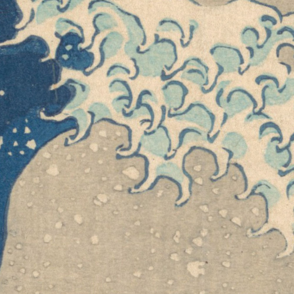 眼前で激しく逆巻く大波と、波間の遥か遠くに鎮座する富士山。