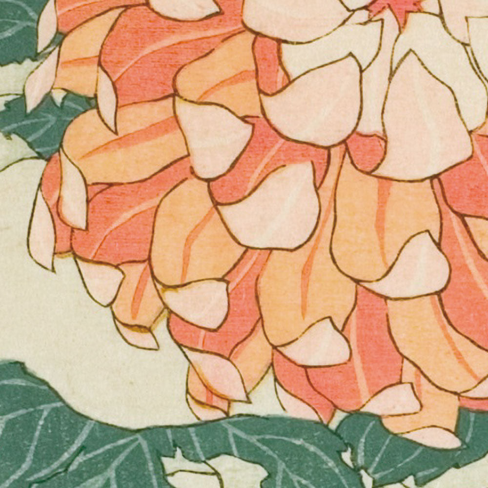 季節の花を描いたシリーズの1枚。秋に咲く菊を描いた錦絵。