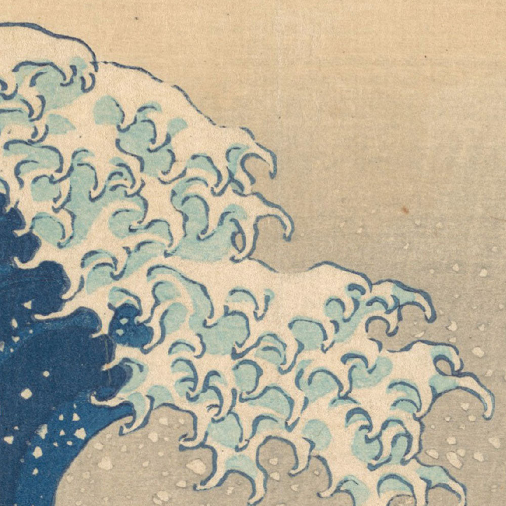 眼前で激しく逆巻く大波と、波間の遥か遠くに鎮座する富士山。