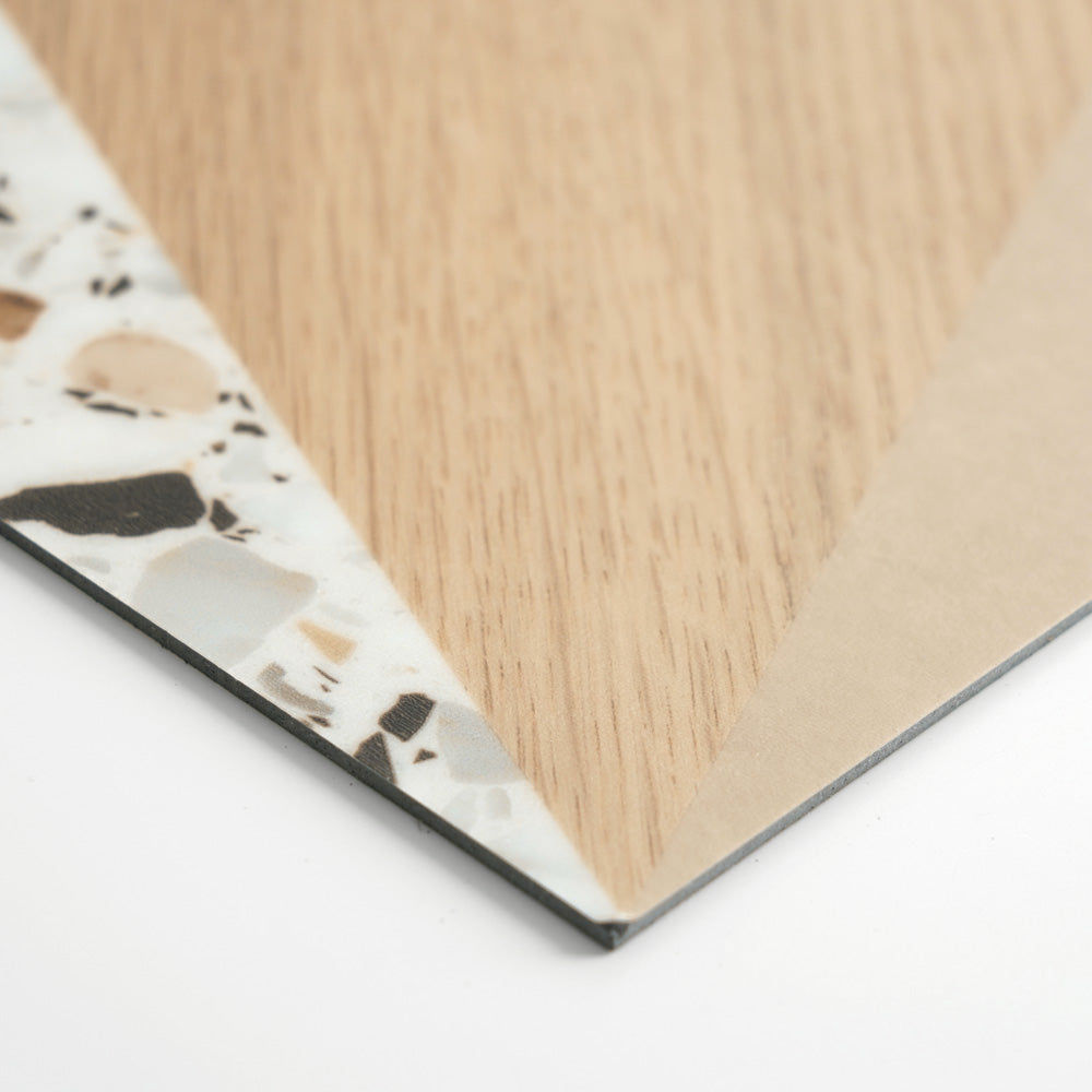テラゾー、木目、スタッコの異素材をミックスした、グラフィカルなタイルです。