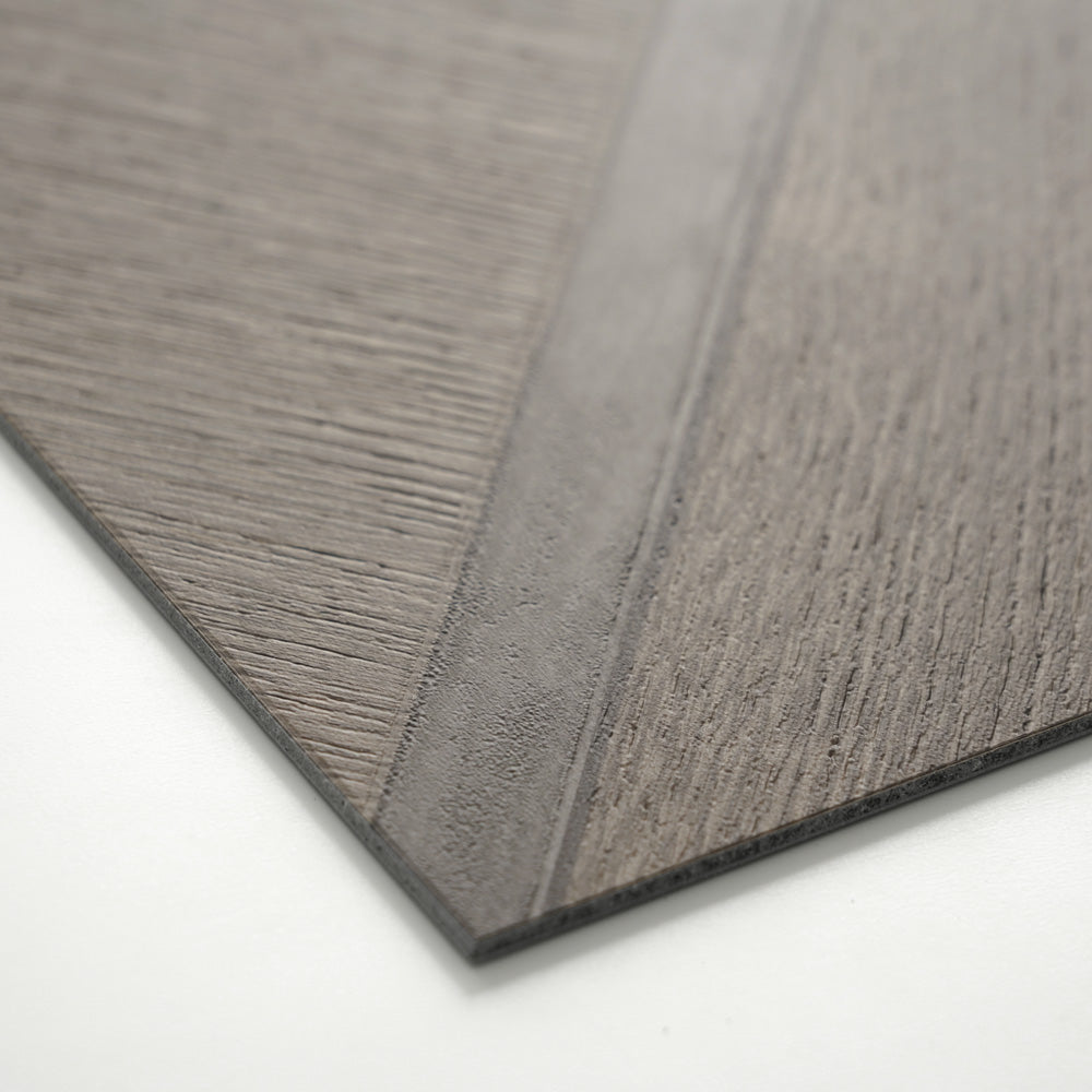 メタルのラインが斜め方向にランダムに入った個性的なウッド柄斜め方向の木目にもエンボスが同調したリアルな表情です。