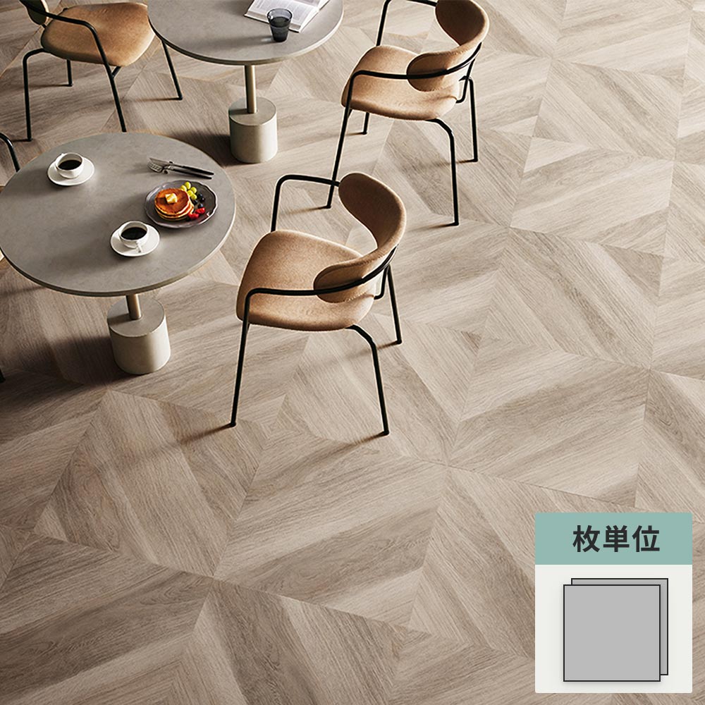 スクエアサイズのバイアス木目柄で、市松貼りにすることで穏やかなパーケットを表現できます。