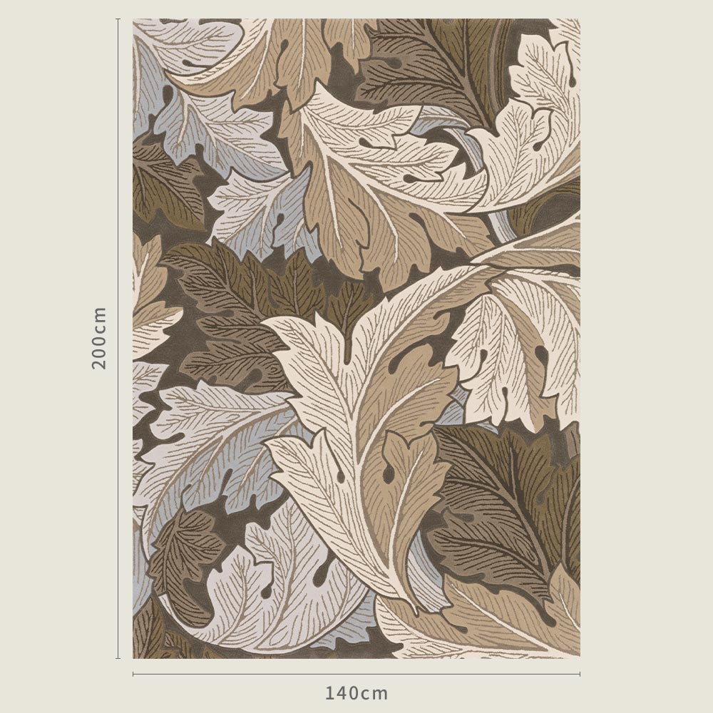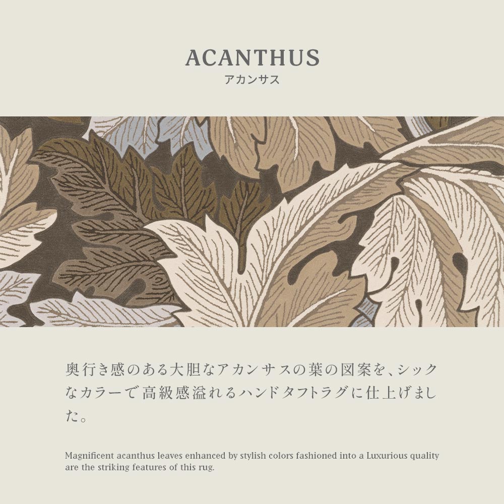 奥行き感のある大胆なアカンサスの葉の図案を、シックなカラーで高級感溢れるハンドタフトラグに仕上げました。