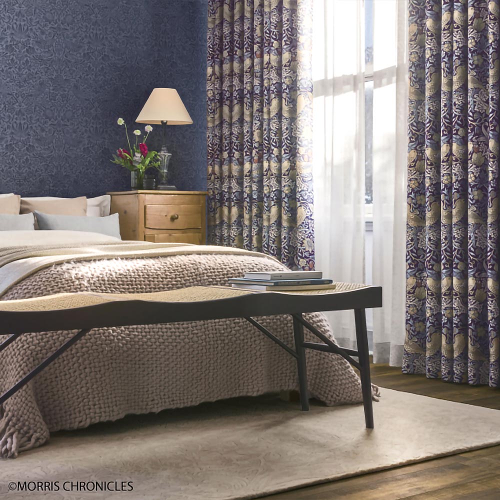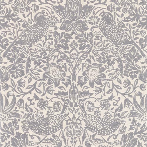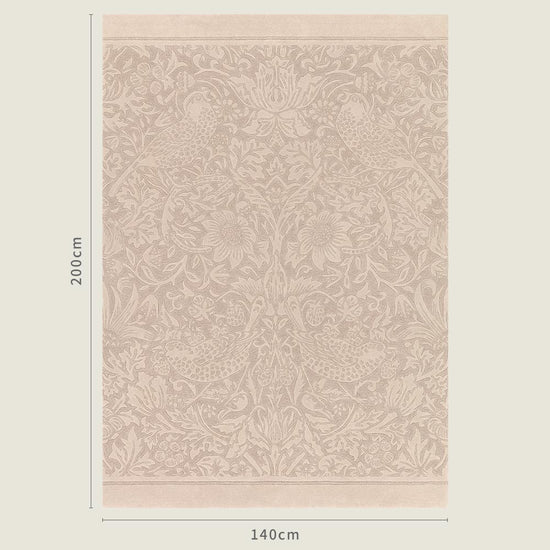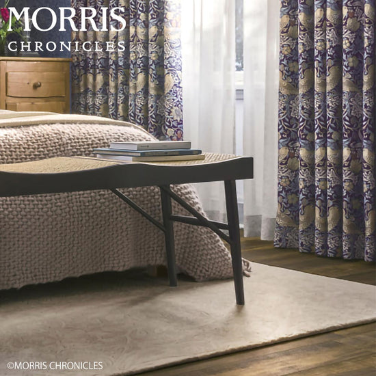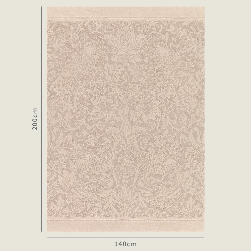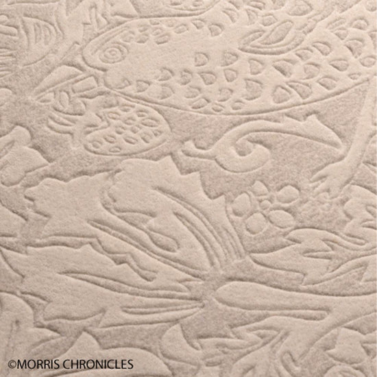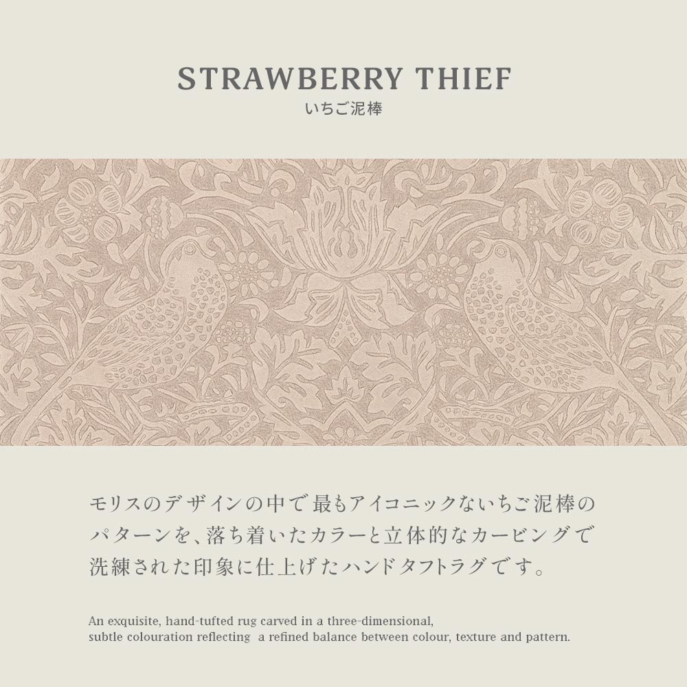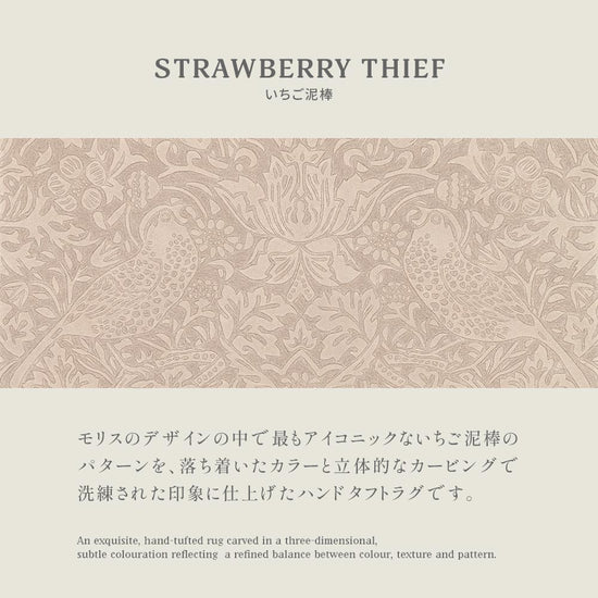 モリスのデザインの中で最もアイコニックないちご泥棒のパターンを、落ち着いたカラーと立体的なカービングで洗練された印象に仕上げたハンドタフトラグです。