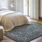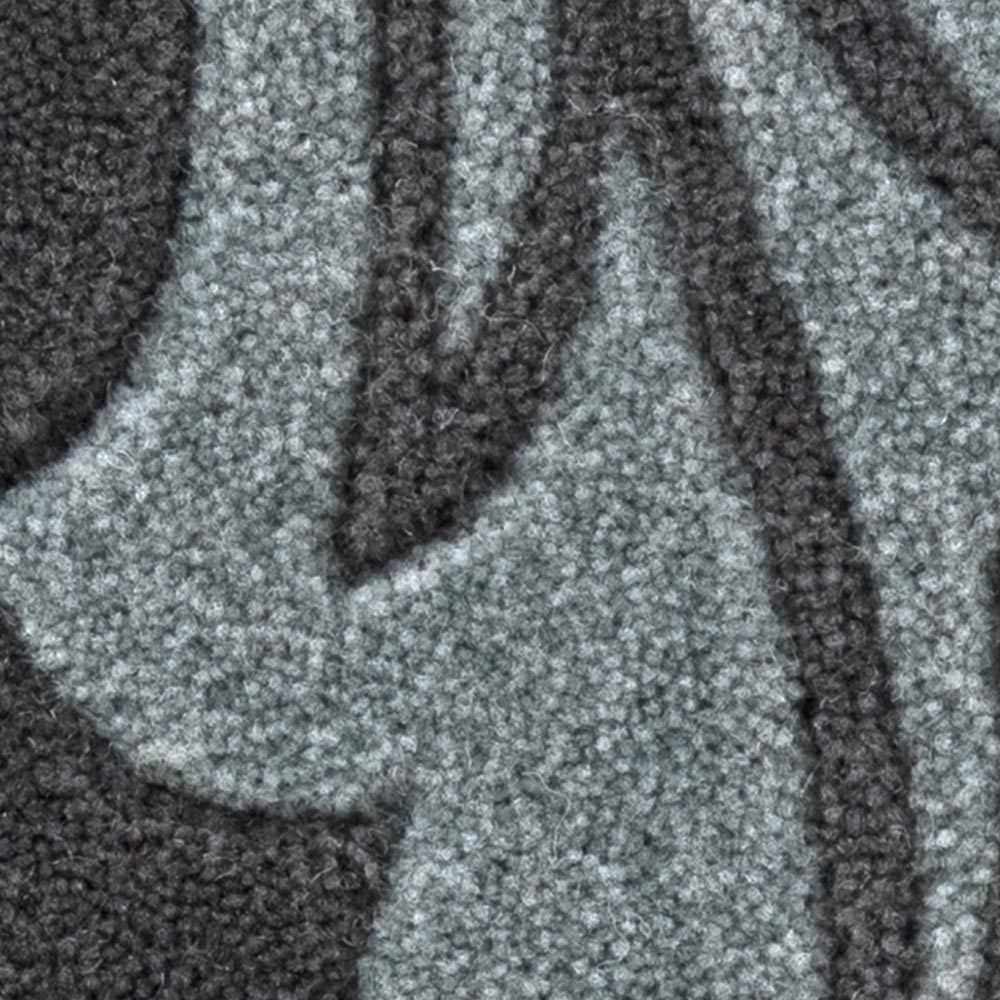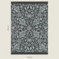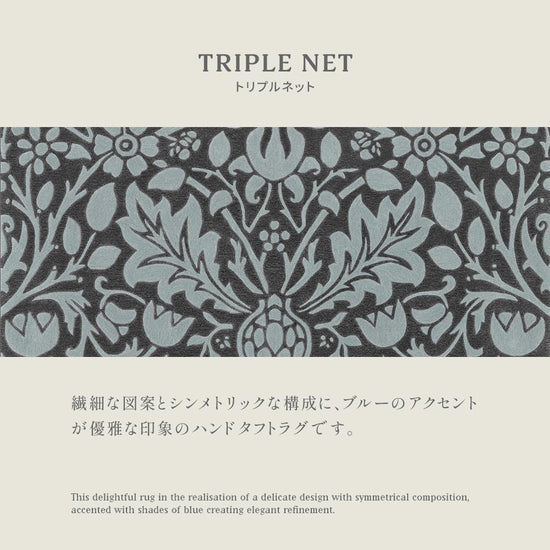 繊細な図案とシンメトリックな構成に、ブルーのアクセントが優雅な印象のハンドタフトラグです。