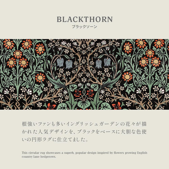 根強いファンも多いイングリッシュガーデンの花々が描かれた人気デザインを、ブラックをベースに大胆な色使いの円形ラグに仕立てました。