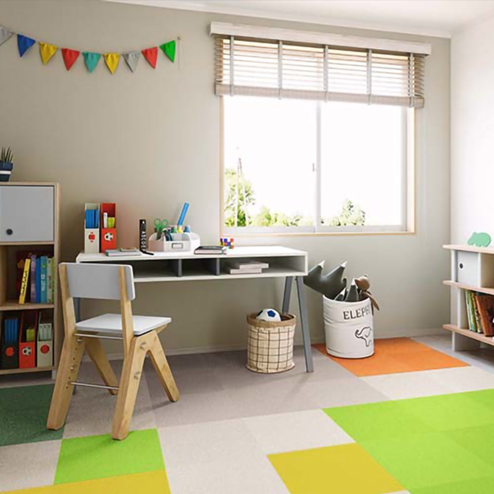 フローリングなどの上に置くだけでずれない、吸着タイプのタイルカーペット。