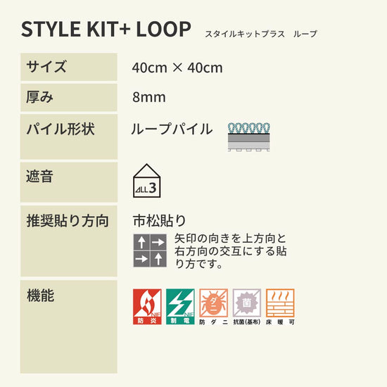| 機能 | 防炎 制電 防ダニ 抗菌 床暖房対応 遮音(ΔLL-3) 機能について詳しく見る >> |