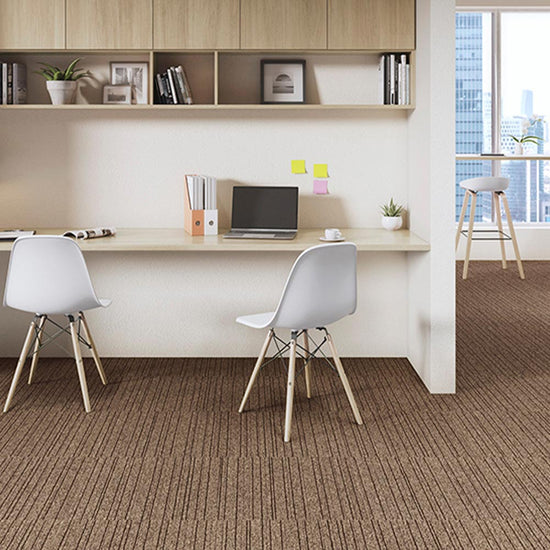 スリムなストライプをランダムに配置したスタイリッシュな柄が特徴のタイルカーペットです。
