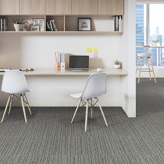 スリムなストライプをランダムに配置したスタイリッシュな柄が特徴のタイルカーペットです。