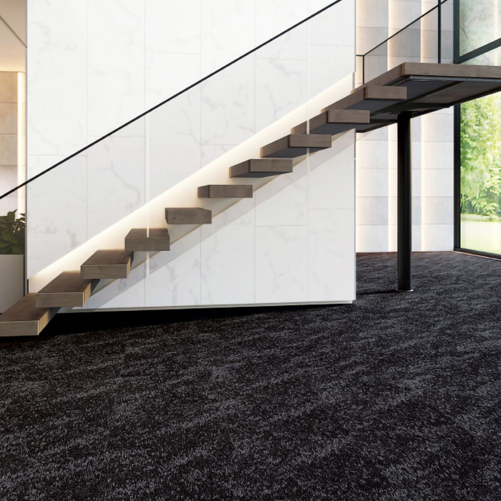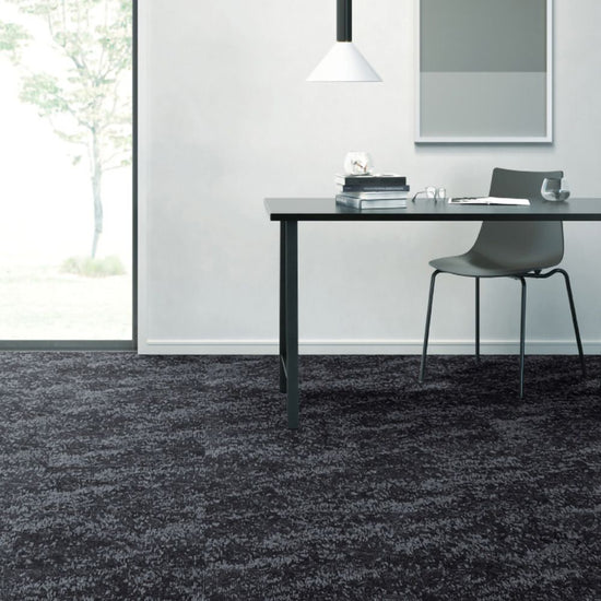 NT-3140シリーズ「SAN HAZY TILE」は、大理石のマルキーナを思わせるストーン調デザインと抽象的なグラフィックを融合させたハイデザインなタイルカーペットです。