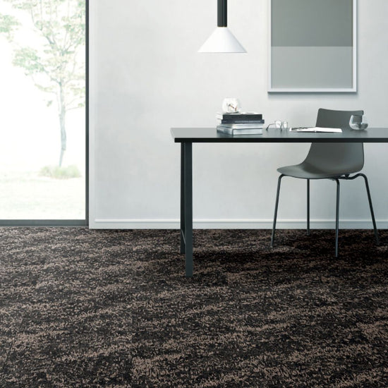 NT-3140シリーズ「SAN HAZY TILE」は、大理石のマルキーナを思わせるストーン調デザインと抽象的なグラフィックを融合させたハイデザインなタイルカーペットです。