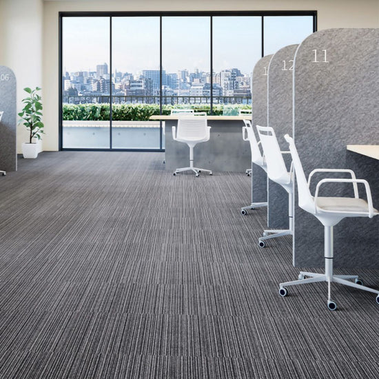 NT-350Vシリーズ「VALUE LINE」は、幅の異なる細いストライプが不規則に並ぶことで、洗練されたリズムと奥行きを生むデザインタイルカーペットです。