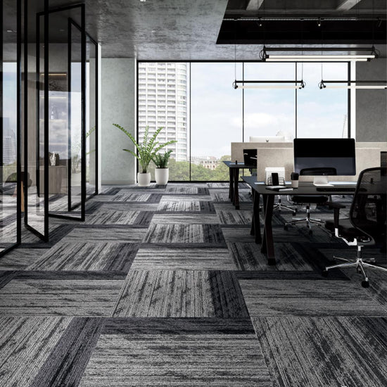 通行量の多い場所に適している「重歩行」に対応した土足OKのタイルカーペット。