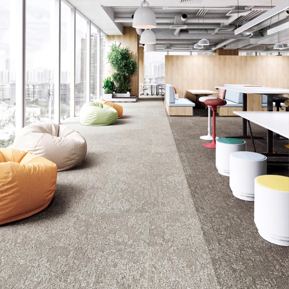 タイルカーペットを敷き並べると、パイルの高低差とまばらな粒感が有機的な表情を生み出します。